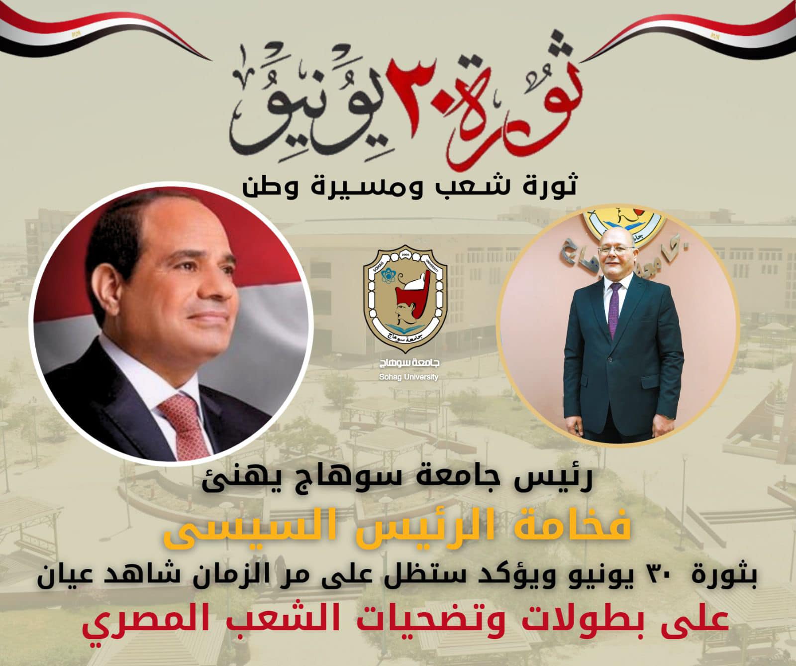 رئيس جامعة سوهاج، يهنئ فخامة الرئيس السيسى بثورة ٣٠ يونيو ويؤكد ستظل على مر الزمان شاهد عيان على بطولات وتضحيات الشعب المصري