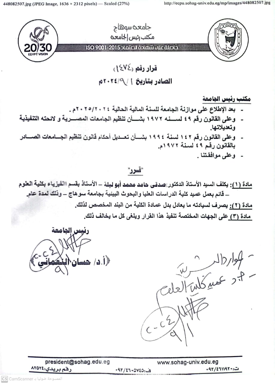 وفي هذا السياق أصدر الدكتور حسان النعماني قرارا بتولي الأستاذ الدكتور صدقي حامد محمد أبوليلة عميدا لكلية الدراسات العليا و البحوث البيئية اعتبارا من بداية فصل الخريف للعام 2024/2025 و الدكتور صدقي أحد أعمدة كلية العلوم بقسم الفيزياء و كانت أبرز اهتماماته البحثية الرئيسية هي تصنيع وتطوير أسلاك نانوية جديدة من أكسيد المعادن وتصنيع وتطوير طلاءات وظيفية بصرية جديدة من أكاسيد وأكسينيتريدات كما ساهم في فهم وتطبيق تكنولوجيا الأغشية الرقيقة وتوصيفها. خلال إقامته في RWTH-Aachen، ألمانيا و العمل مع قسم أبحاث وتطوير المنتجات في Interpane GMBH و مسيرته البحثية تتعدى 105 ورقة بحثية في مجلات محكمة و 10 أوراق بحثية قدمت في مؤتمرات محكمة. وكان حائزًا على العديد من الجوائز المرموقة مثل DAAD (ألمانيا) وFulbright (الولايات المتحدة الأمريكية) وTEMPUS (إسبانيا).
