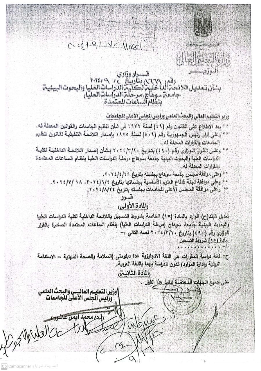 طبقا للقرار الوزاري رقم 1669 بتاريخ 2024/9/2بشأن تعديل اللائحة الداخلية لكلية الدراسات العليا و البحوث البيئية بجامعة سوهاج بنظام الساعات المعتمدة .