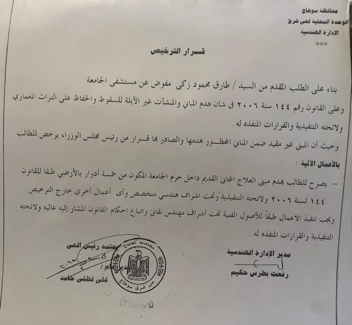 بناءاً على تقرير مركز الاستشارات الهندسية واللجنة المنوطه بحي شرق الموافقة على هدم المبني المجاني القديم بمستشفى سوهاج الجامعي حفاظاً على أرواح المرضى والأطقم الطبية