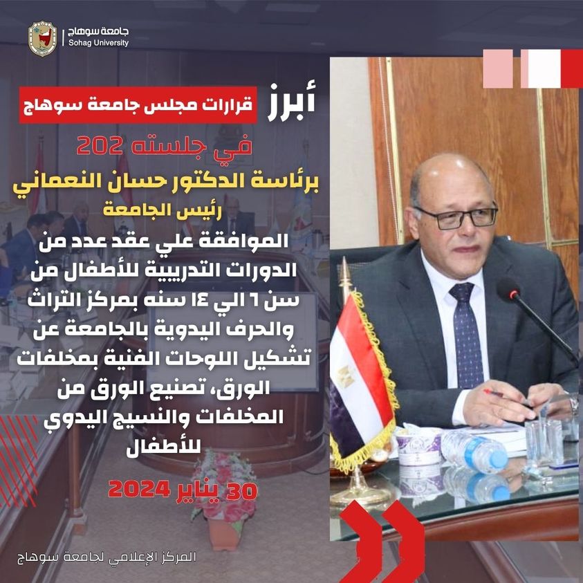 الدكتور حسان النعماني رئيس جامعة سوهاج، يترأس الجلسة الشهرية لمجلس الجامعة رقم ٢٠٢ لشهر يناير لعام ٢٠٢٤م. بحضو لفيف من اعضاء هيئة التدريس بمقره بالجامعة القديمة بمدينة ناصر و هى تتلخص فى الاتى :