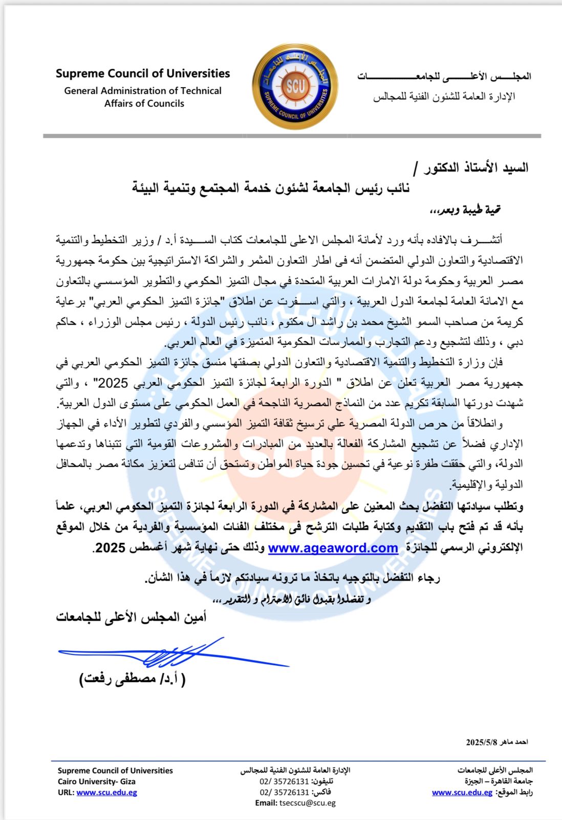 في اطار التعاون المثمر والشراكة الاستراتيجية بين حكومة جمهورية مصر العربية وحكومة دولة الامارات العربية المتحدة في مجال التميز الحكومي والتطوير المؤسسي بالتعاون مع الأمانة العامة لجامعة الدول العربية ، والتي اسفرت عن اطلاق جائزة التميز الحكومي العربي” برعاية كريمة من صاحب السمو الشيخ محمد بن راشد آل مكتوم، نائب رئيس الدولة ، رئيس مجلس الوزراء ، حاكم دبي ، وذلك لتشجيع ودعم التجارب والممارسات الحكومية المتميزة في العالم العربي.