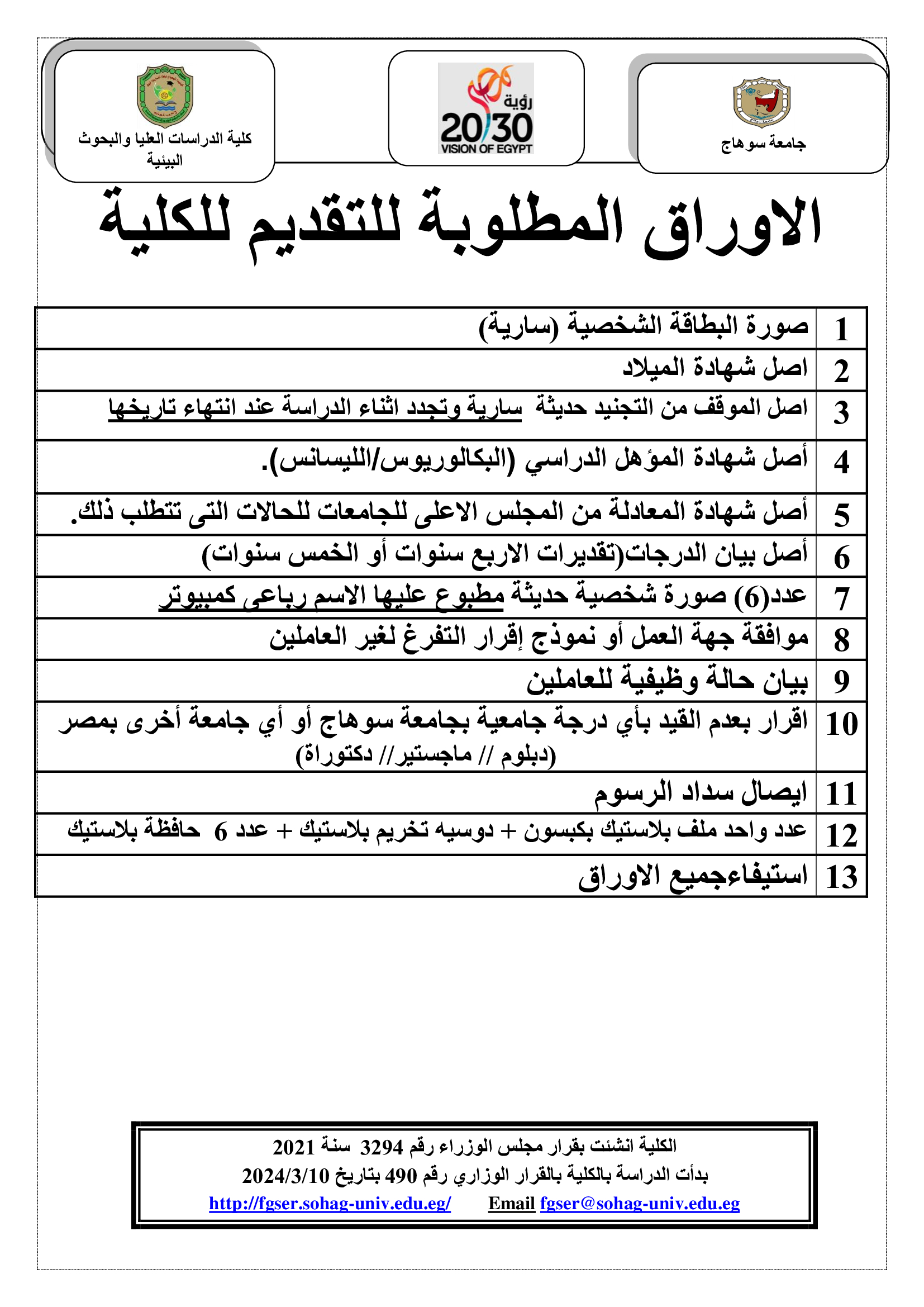 تنويه….. تستعد كلية الدراسات العليا و البحوث البيئية جامعة سوهاج لفصل دراسي جديد ” فصل خريف 2025/2026 ” خلال الأيام القليلة القادمة و ذلك لقبول باحثين جدد في البرامج المختلفه بالكلية و فتح باب التقديم لمنح درجات علمية في مختلف المجالات العلمية و البيئية عبر برامج ( الدبلومات – الماجستير – الدكتوراه ) وفق ساعات معتمدة وعبر تلقي الطلاب المنتسبين علوم بحثية وفق الاستراتيجيات التعليمية العالمية التى تبرزهم ككوادر بحثية و مهنية مؤهلة لخدمة المجتمع .