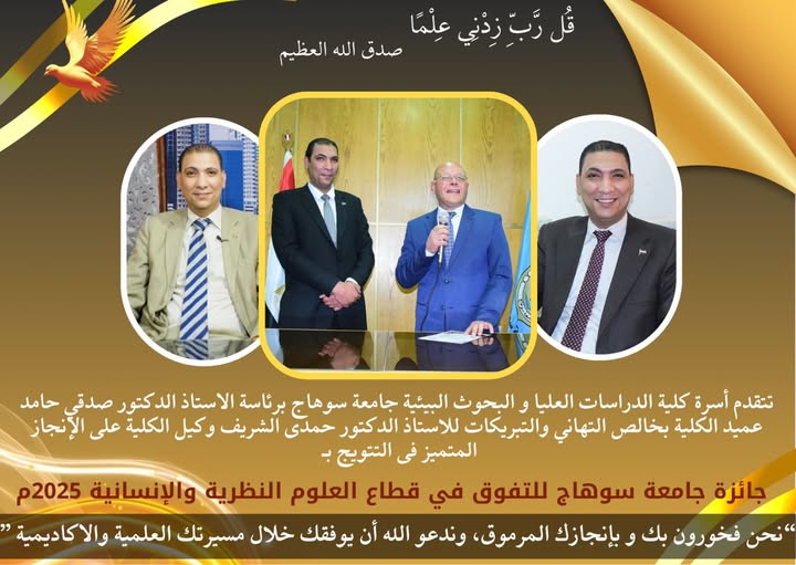 يتقدم الأستاذ الدكتور صدقي حامد عميد كلية الدراسات و البحوث البيئية و الهيكل الإداري بالكلية بخالص التهاني القلبية الى الأستاذ الدكتور حمدي الشريف وكيل الكلية بمناسبة حصوله على جائزة جامعة سوهاج للتفوق في قطاع العلوم النظرية و الإنسانية 2025 …. داعيين الله المزيد من النجاح و التفوق و الرقي .